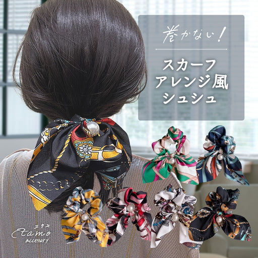 【日常に、彩を。】 緩やかな生地感に艶やかなパールがいつものヘアスタイルをランクアップ。《 1. 結ぶだけでテクニックいらず! 》 忙しくても器用さんでも大丈夫。ひと結びで、まるでスカーフで結んだような華やかな仕上がりに。 《 2. こだわりの色使いとスカーフ柄。 》いつものシンプルな見た目...