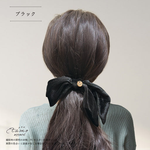 Etamo【いつものヘアアレンジに華やかさをプラス】 《 1.コーディネートの格上げに。 》 温かみのあるベロア生地がリッチなシュシュ。 たらりと垂れるリボンが上品な仕上がりに。 シンプルな1つ結びでも洗練された華やかさを演出します。 《 2.ミディアムからロングヘアまで、美しく仕上がるサイズ感...