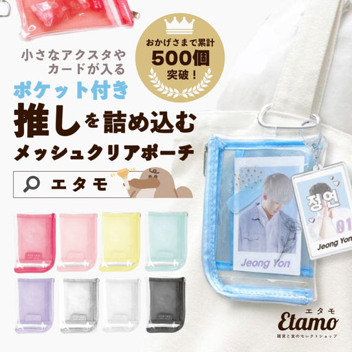 Etamo韓国でも大人気!! 推し活やコレクションケースにぴったりのカラビナ付きクリアポーチが登場! 推しカラーを見つけておしゃれにコーディネイト♪ クリアなポーチにマイルドな色味の ファスナー&メッシュポケットがとってもキュート! トレカが入れられるクリアポケット付きです。 ポーチタイ...