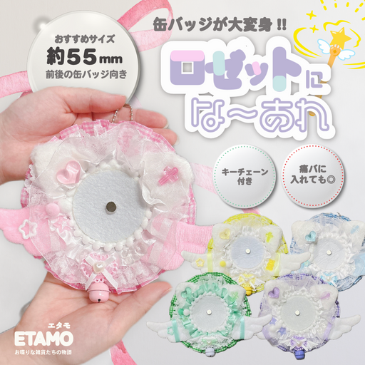 Etamo推しの缶バッジを取り付けるだけで完成♪ 不器用さんや忙しくて時間の無い方でも 簡単に推しのロゼットが作れる『デコり済みロゼット』です。 たっぷりのフリルやレースに、 猫耳や天使の羽など可愛らしいパーツをたっぷり詰め込みました♪ バッグに付けて出かけたり 痛バの中に飾ってみたり… も...